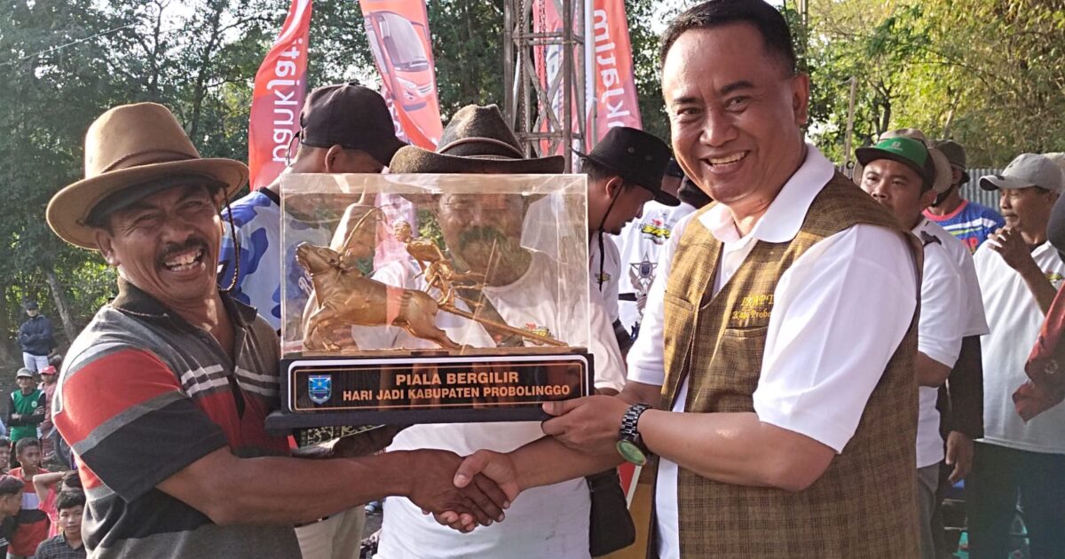 kliksurabaya.co.id-Sekretaris Daerah (Sekda) Kabupaten Probolinggo Ugas Irwanto resmi menutup lomba kerapan sapi Bupati Cup 2023 yang digelar oleh Dinas Pendidikan dan Kebudayaan (Disdikdaya) Kabupaten Probolinggo bekerja sama dengan Paguyuban Kerapan Sapi Kabupaten Probolinggo di Lapangan Kerapan Sapi Desa Tempuran Kecamatan Bantaran Kabupaten Probolinggo, Minggu (4/6/2023) sore.